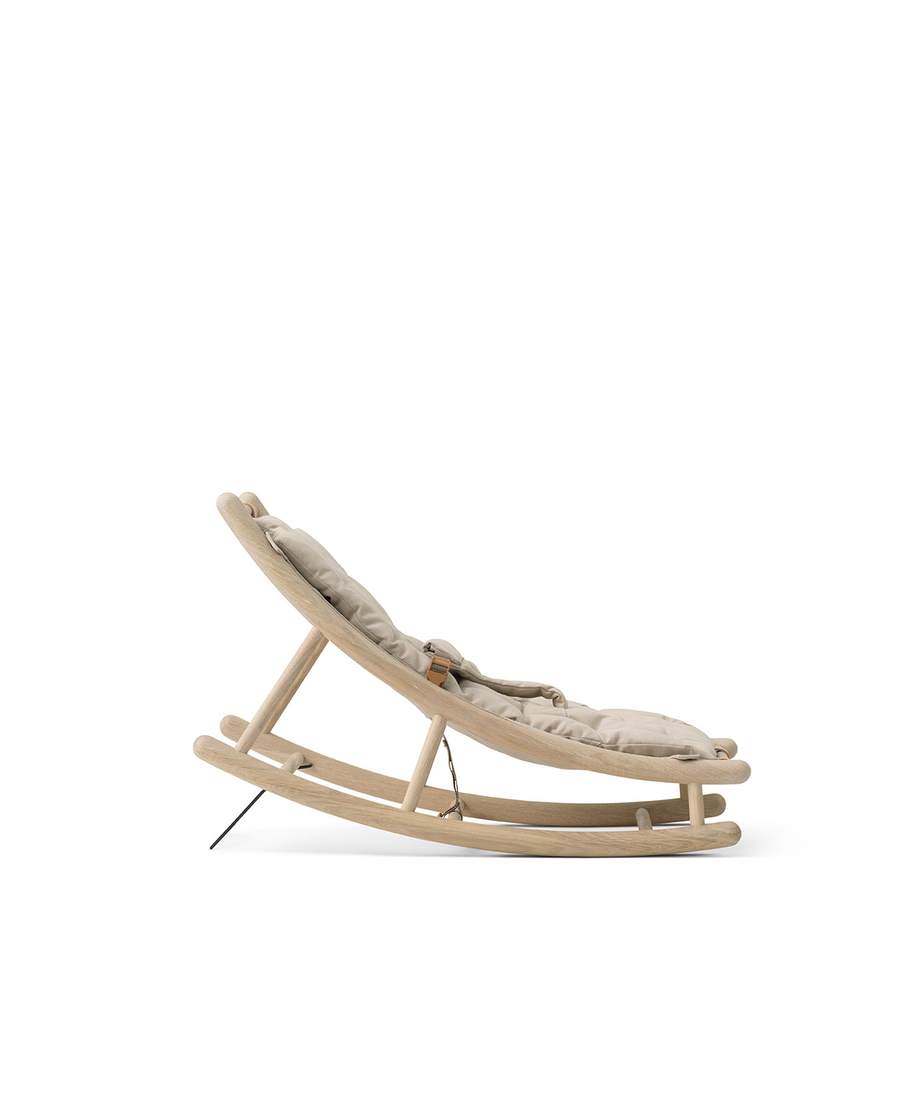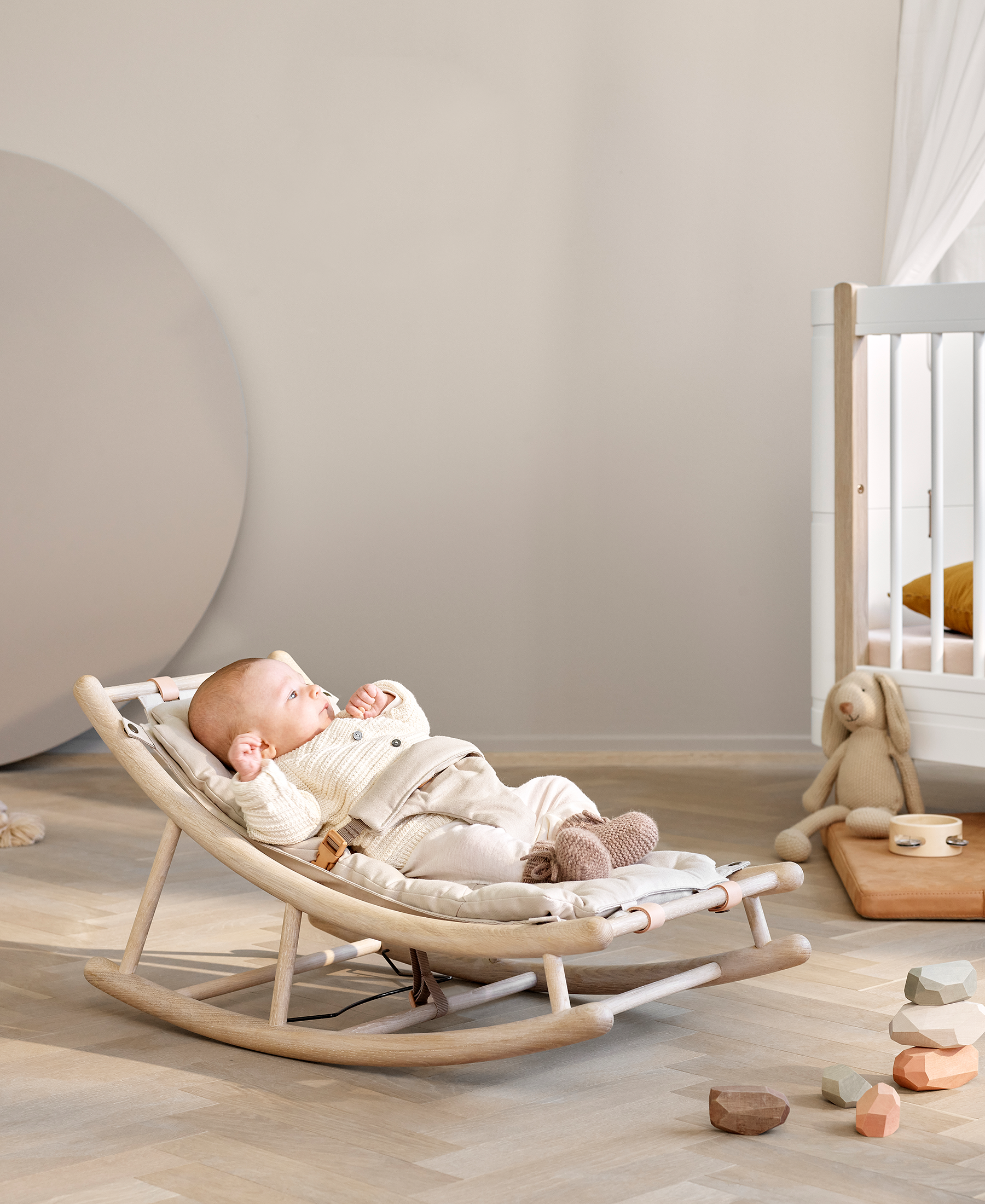 Die Babywippe definiert sich durch ihre klassische nordische Formensprache. Die abgerundeten Details schaffen eine visuelle Leichtigkeit und einen unbeschwerten Ausdruck, außerdem wirken die weichen Formen der Babywippe ansprechend und beruhigend auf das kleine Kind.