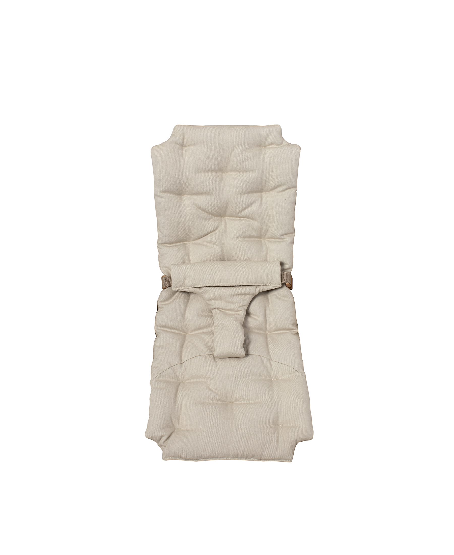 Das Babykissen wird mit einem Klettverschluss am Kleinkindsitz befestigt und der Kleinkindsitz wird mit Druckknöpfen und Lederriemen an der Wippe befestigt.